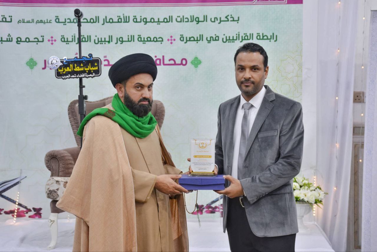 Basra - The delegate of the office of His Eminence, the Grand Religious Authority, Sheikh Bashir Al-Najafy (may Allah prolong his life), in Basra Province honored an elite group of Quran recitation teachers from the Al-Nour Al-Mubeen Quranic Association, in appreciation of their blessed efforts in building a conscious, Quranically-educated generation and contributing to the spread of Quranic culture among various segments of society.The delegate