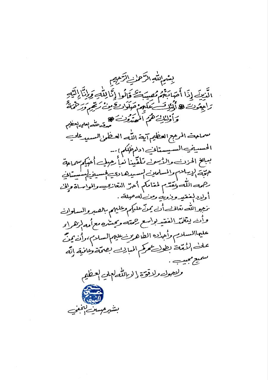 پیام تسلیت به محضر مرجع عالیقدر السیستانی (دام ظلکم)